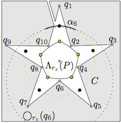 Abstract: We study generalizations of convex hulls to polygonal domains with holes.Convexity in Euclidean space is based on the notion of shortest paths, whichare straight-line segments. In a polygonal domain, shortest paths arepolygonal paths called \emph{geodesics}.One possible generalization of convex hull is based on the ``rubber band''conception of the convex hull as a shortest curve that encloses a given set ofsites. However, we show that it is NP-hard to compute such a curve in ageneral polygonal domain. Hence we focus on a different, more directgeneralization of convexity, where a set $X$ is \emph{geodesically convex} ifit contains all geodesics between every pair of points $x,y\in X$. Thecorresponding \emph{geodesic convex hull} presents a few surprises and turns out to behavequite differently compared to the classic Euclidean setting and to thegeodesic hull inside a simple polygon. As a main result, we describe a classof polygonal domains that suffice to represent geodesic convex hullsand characterize which such domains are geodesically convex. Using such arepresentation we present an algorithm to construct the geodesic convex hullof a set of $O(n)$ sites in a polygonal domain with a total of $n$ vertices and$h$ holes in $O(n^3h^{3+\varepsilon})$ time.